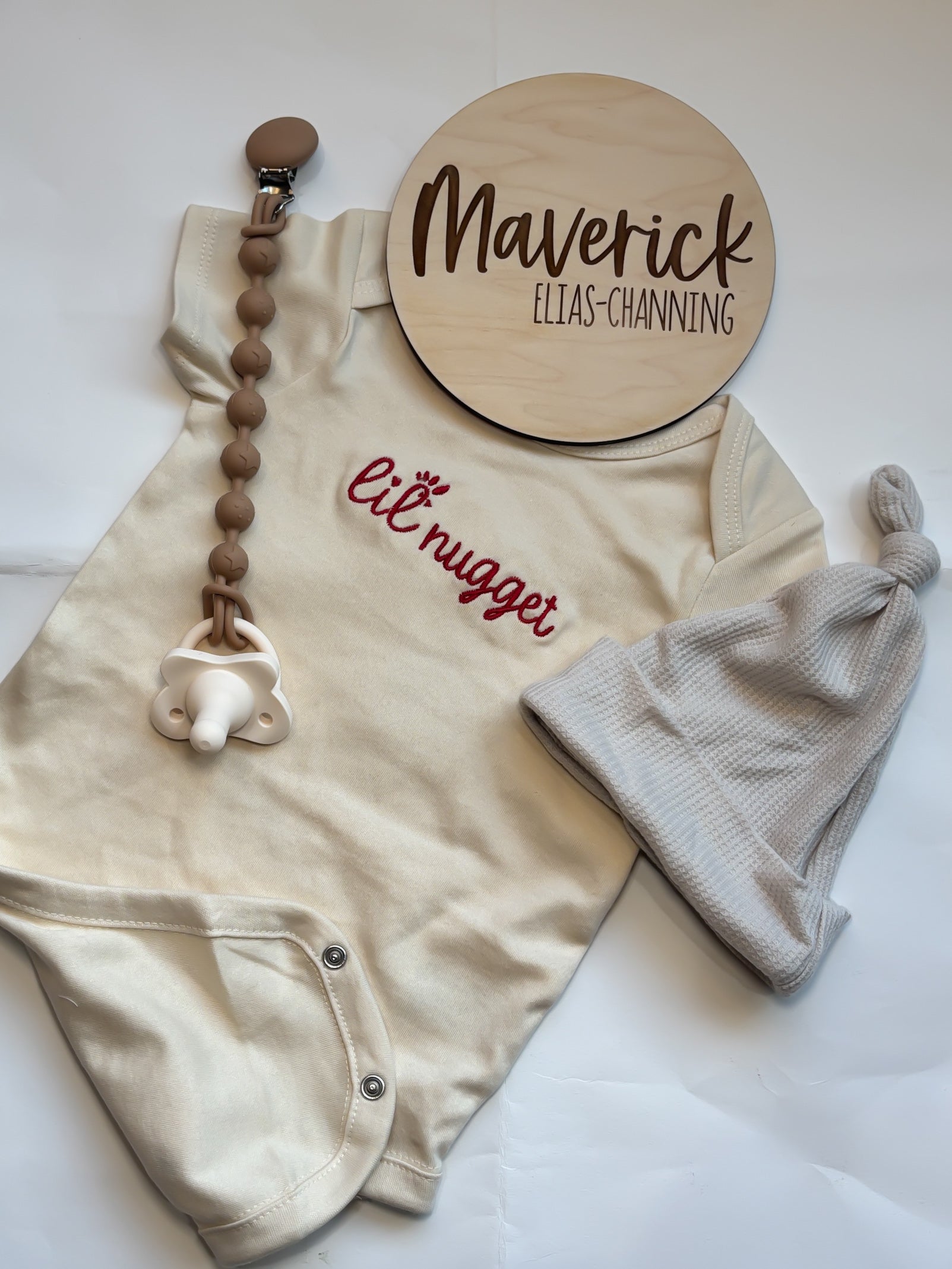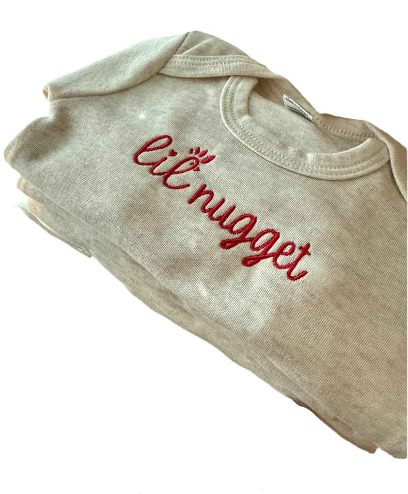 Get your little one dressed in style with the Lil Nugget š Beige Onesie. Inspired by chic fil a, this embroidered onesie is a playful and quirky addition to any baby's wardrobe. Perfect for mealtime or playtime, it's sure to make a statement!